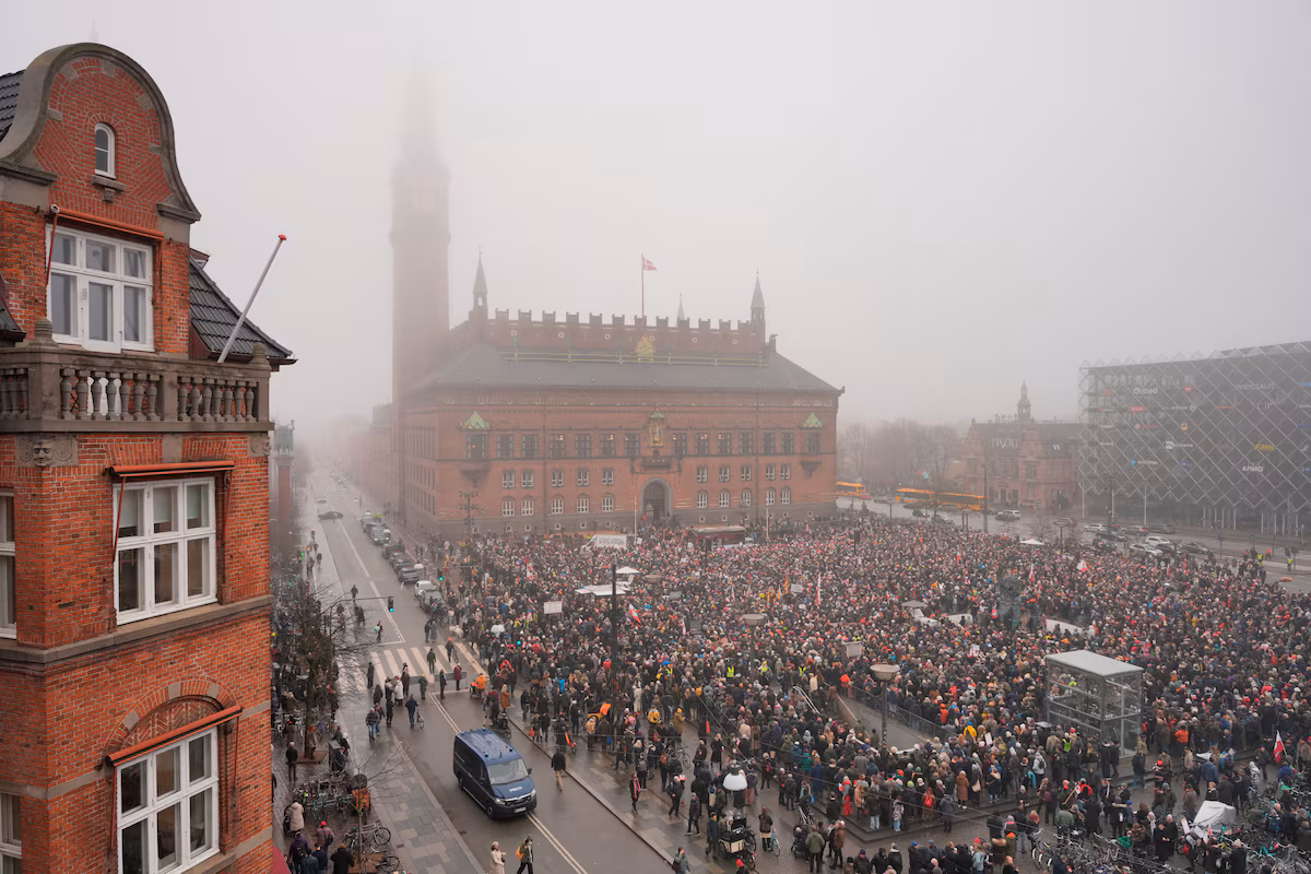 Demonstrators gathered in cities including Copenhagen, Aarhus, Aalborg, Odense and Nuuk, marching with Danish and Greenlandic flags and chanting slogans such as “Hands off Greenland” and “Greenland is not for sale.”