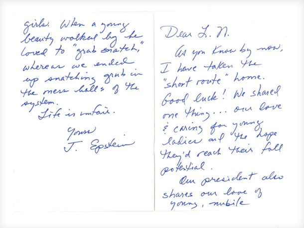 Then the letter says … “When a young beauty walked by he loved to ‘grab snatch,’ whereas we ended up snatching grub in the mess halls of the system. Life is unfair.” It’s signed, “Yours J. Epstein.”