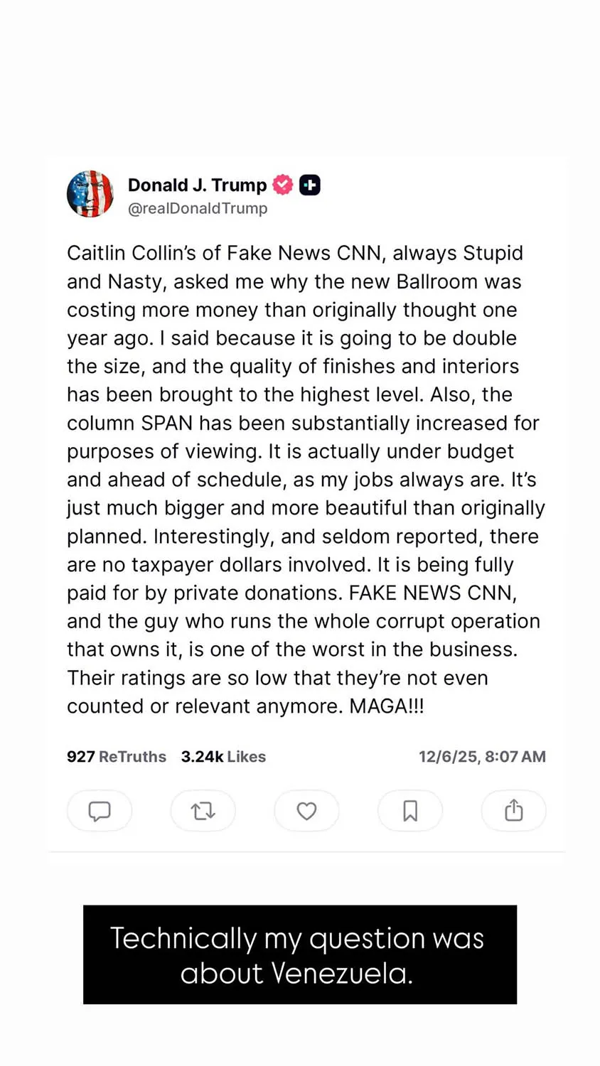 “Technically, my question was about Venezuela,” wrote Collins, referring to the growing tension between the country and the U.S. — including the Trump administration’s bombing of alleged drug vessels off the coast and Trump’s threats of escalation and calls for Venezuelan President Nicolás Maduro to step down.