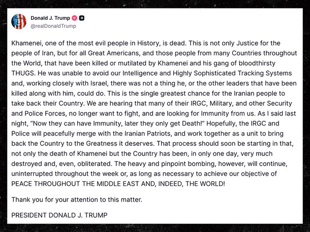 It’s been widely reported that Iran’s Supreme Leader Ali Khamenei was killed during these strikes, with President Trump also writing a lengthy post on Truth Social about his death.